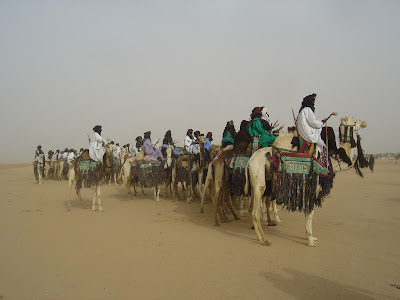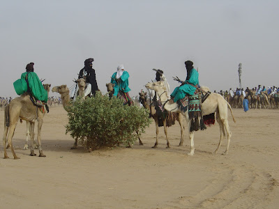 We finally found a dark room at the Hotel Agriboun, where the ceiling fan did its best to move the hot air. Streams of people and Toyotas were going to the North – a grande fantasia was to take place in honour of the Colonel. Every 100 metres a soldier stood guard. On the outskirts of town there was an amazing sight - thousands of camel-borne Tuareg and Fula lined up in full ceremonial style surrounded a crowd that represented every tribe in the country, also in their best. The camels stand very patiently flank to flank, not bothered by the size of the crowd. A line of tall young Wodaabé men stood in front of the camels, their faces painted. They are famous for the annual Cure Salée festival, where their make-up and dancing are used to attract a bride. I got the impression they had already being waiting for hours, and after a few requests my water was gone.
